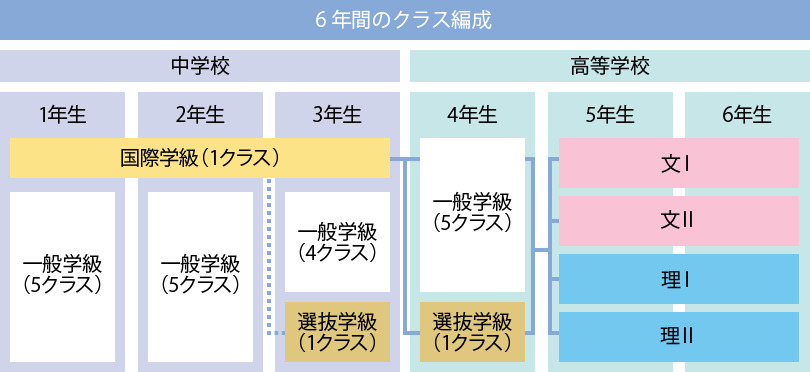 4年次からは一般学級の生徒と一緒になり、本校独自のカリキュラムに基づいたクラス編成に。5年次からは卒業後の進学先に応じた少人数のクラス編成となり、大学受験にきめ細かく対応します。